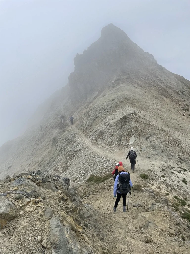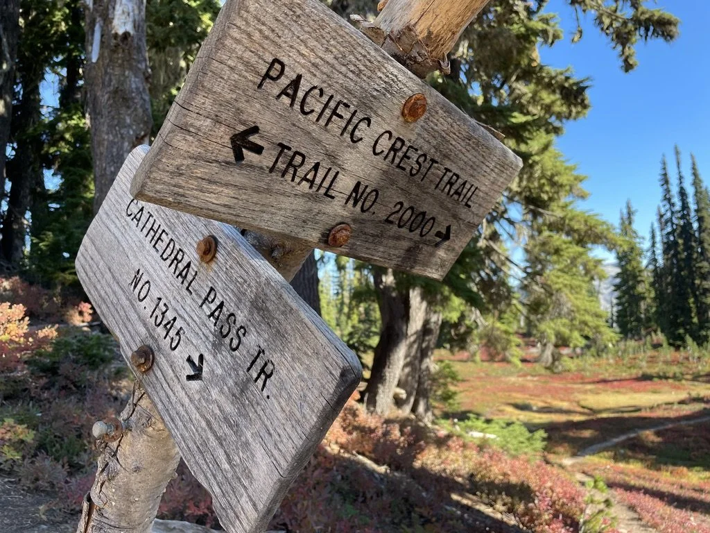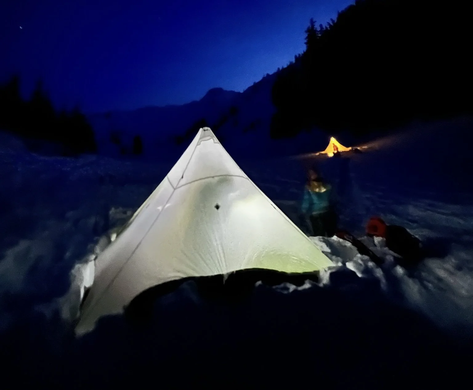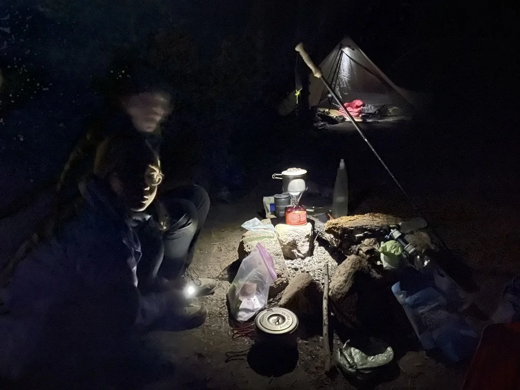 On the trail, at camp, at night.